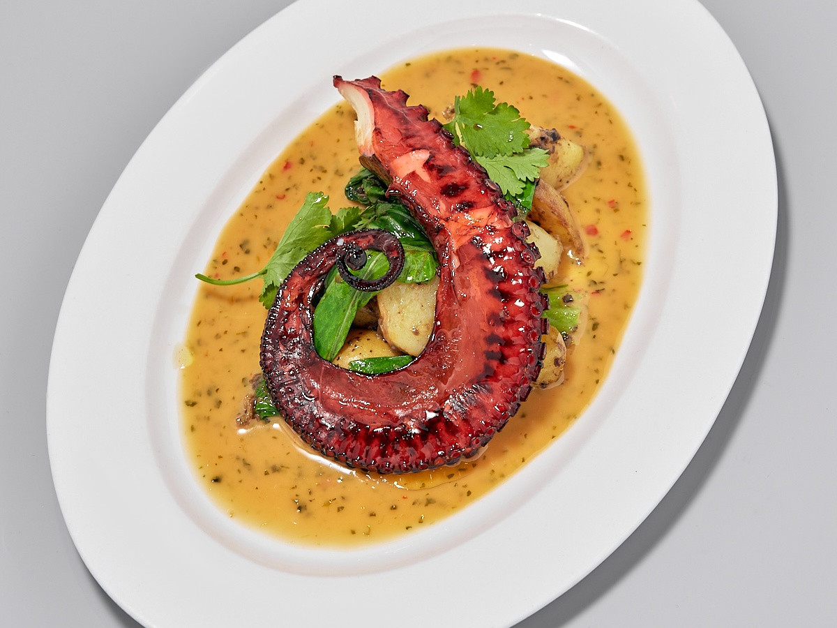 Щупальца осьминога, шпинат, картофель мини, соус кокосовый, масло чесночное |