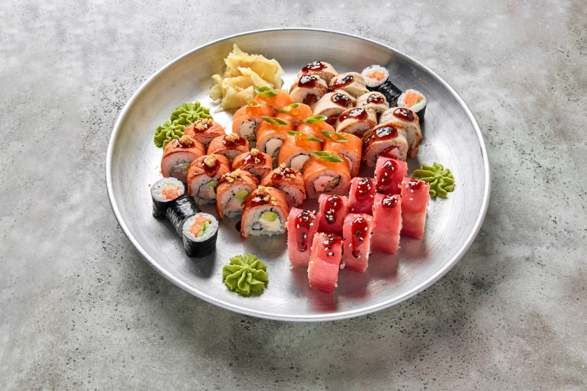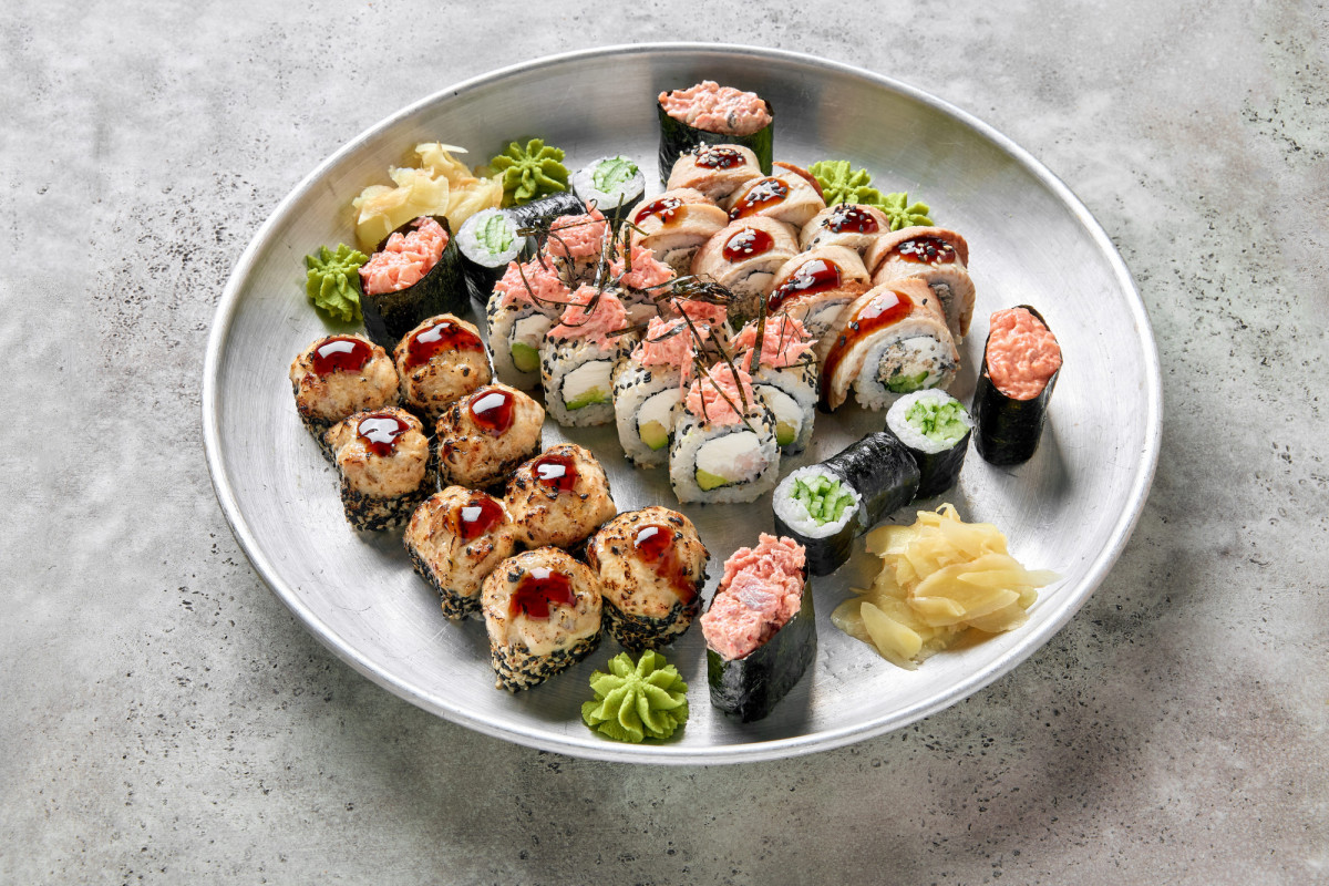 Ролл Канада 8 шт., ролл нерка с карамелью 8 шт., маки ролл с красной рыбой 6 шт., ролл много рыбы 8 шт., ролл Филадельфия 8 шт.