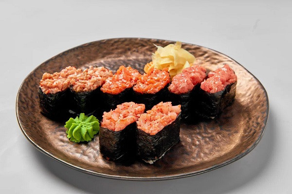 Суши гункан креветка 2 шт., суши гункан с красной рыбой 2 шт., суши гункан тунец 2 шт., суши гункан угорь 2 шт.